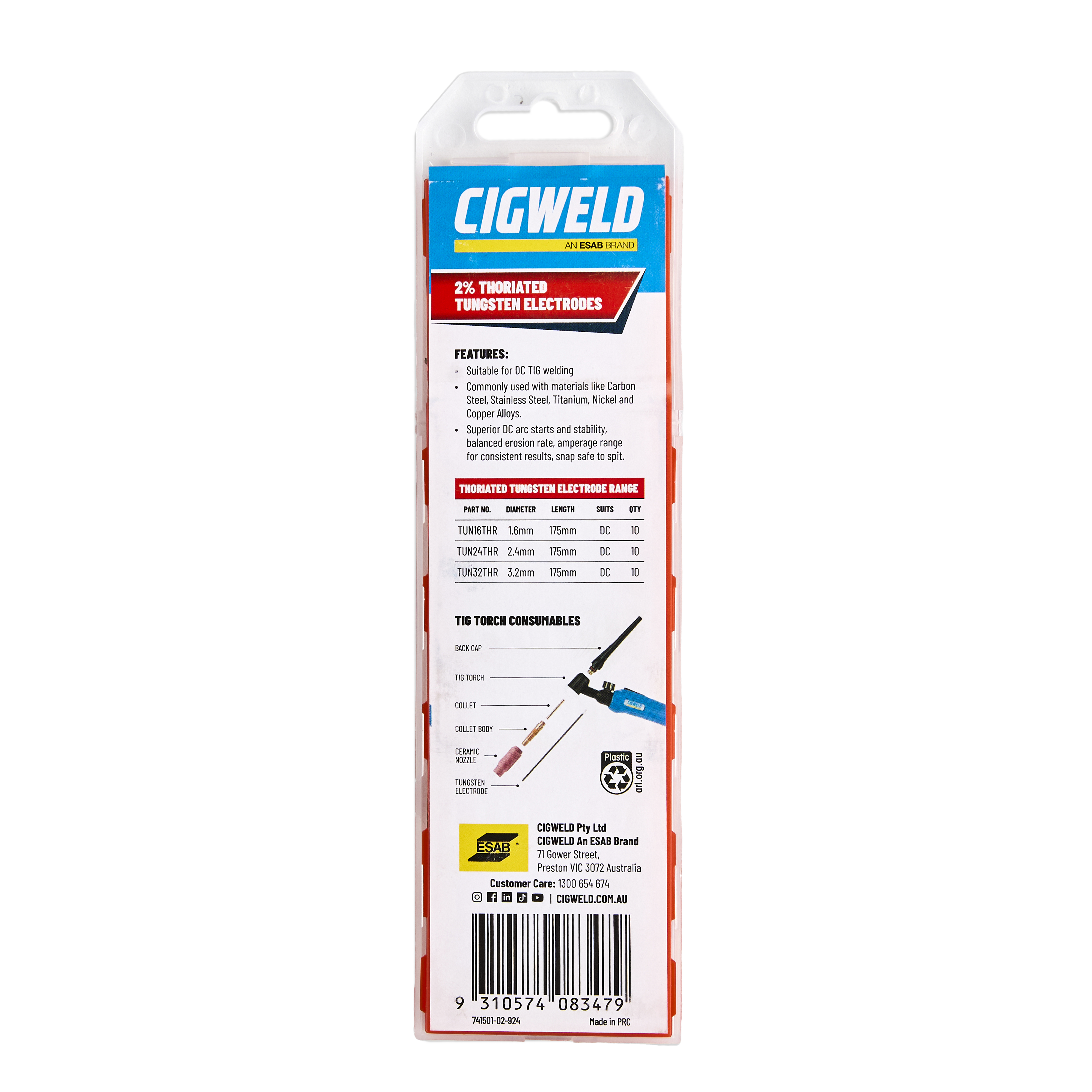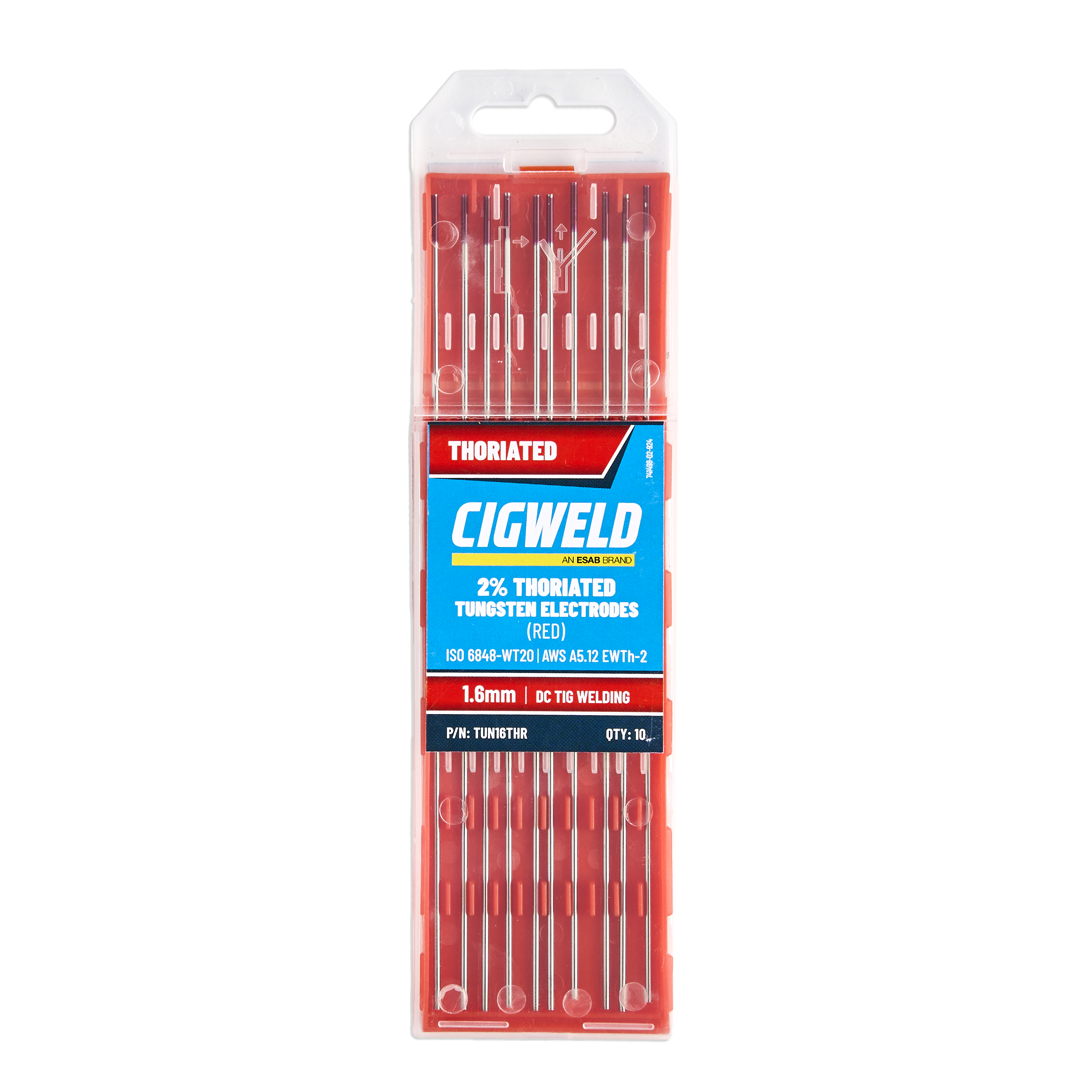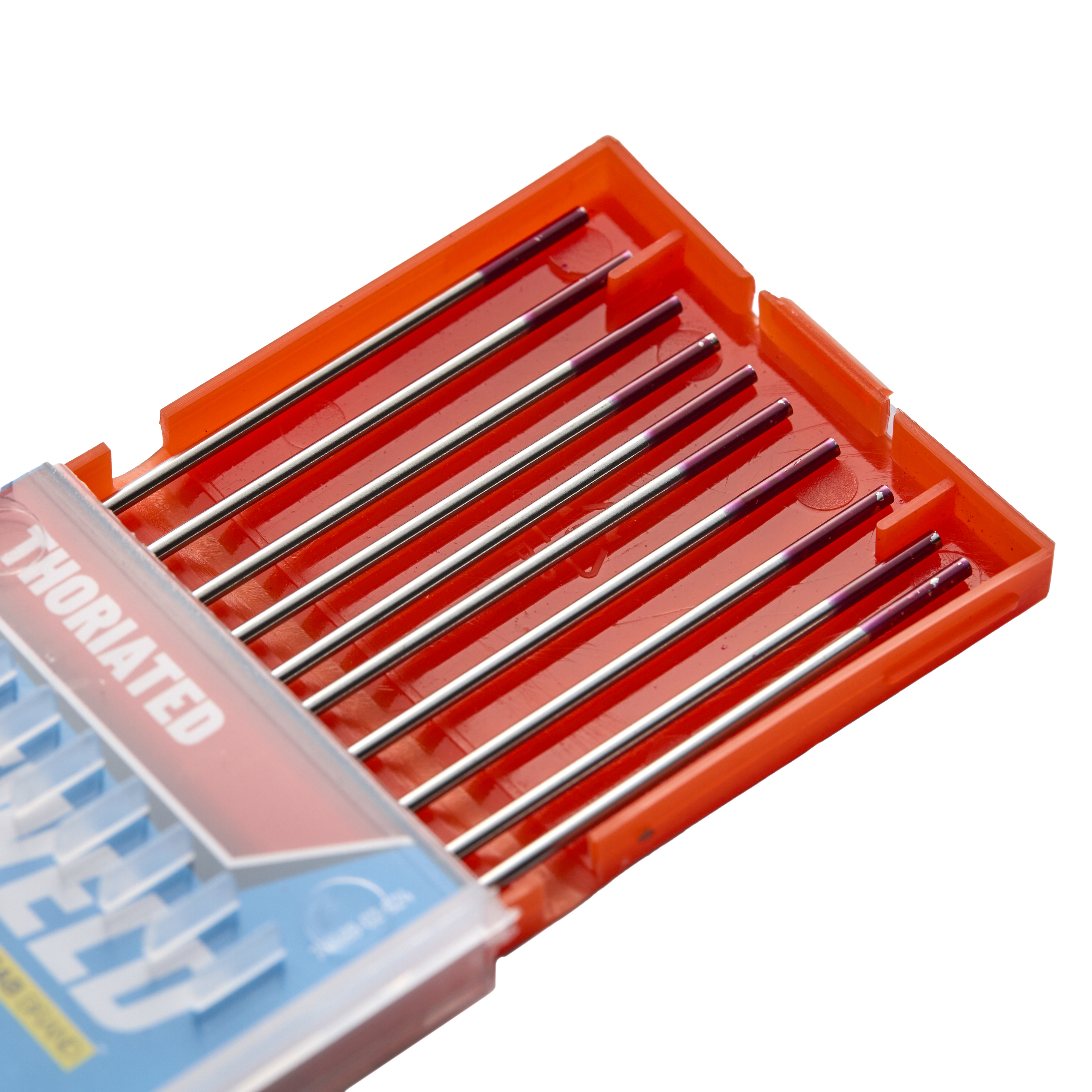 2% Thoriated Red Tip Tungsten Electrodes(AWS classification EWTh-2) is radioactive, idea for TIG DC welding applications. Provides excellent arc starting, stability, and current capacity.