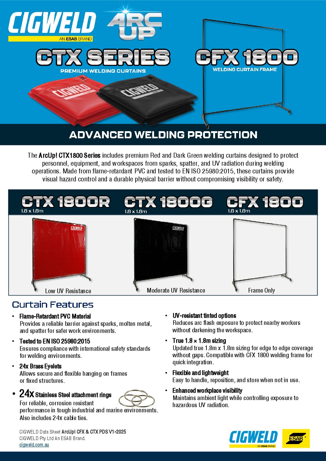 Designed for durability and compliance, the Arc Up! Premium Red Welding Curtain offers moderate transparency and UV protection. Constructed with flame-resistant material and reinforced with Kevlar stitching, it provides effective shielding against sparks, spatter, and molten metal. Fitted with brass grommets and fully compliant with EN 25980:2015, it delivers reliable performance for professional welding environments.