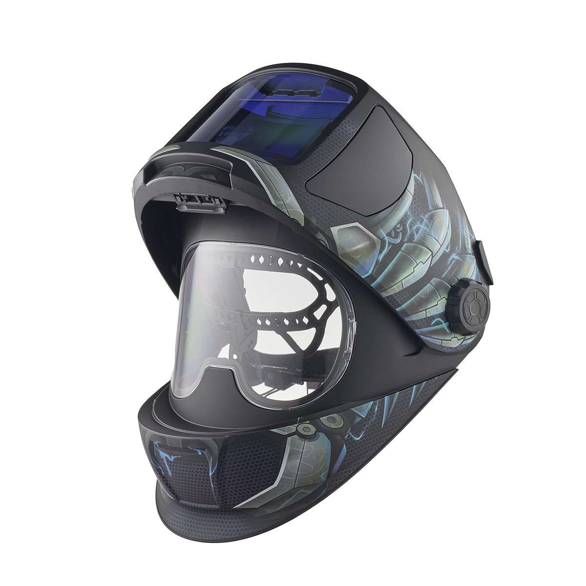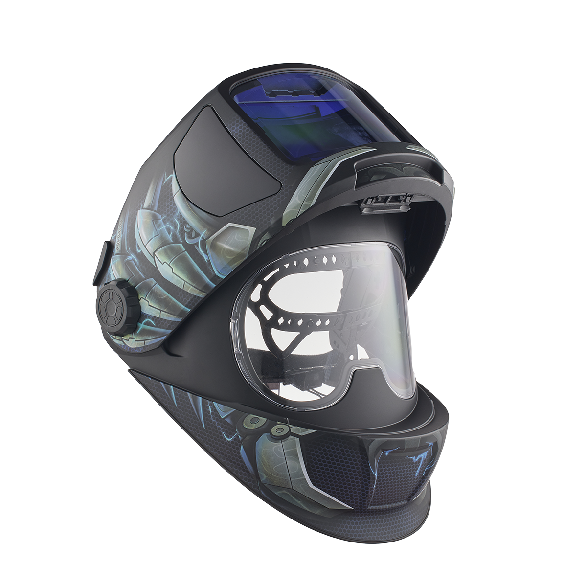 The XC90F features one of the largest viewing areas in a flip welding helmet at 118mm x 83mm = 99mm² combined with an even larger clear grinding visor at 240mm x 120mm = 170mm² for an unrestricted view of the workpiece. The viewing experience is enhanced by 2 shade 5 passive side windows that offers an extraordinary panoramic view of the weldment. Passive side windows covers are also included with the helmet for welders who prefer slightly restricted view.