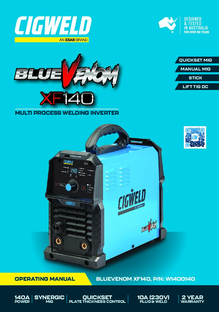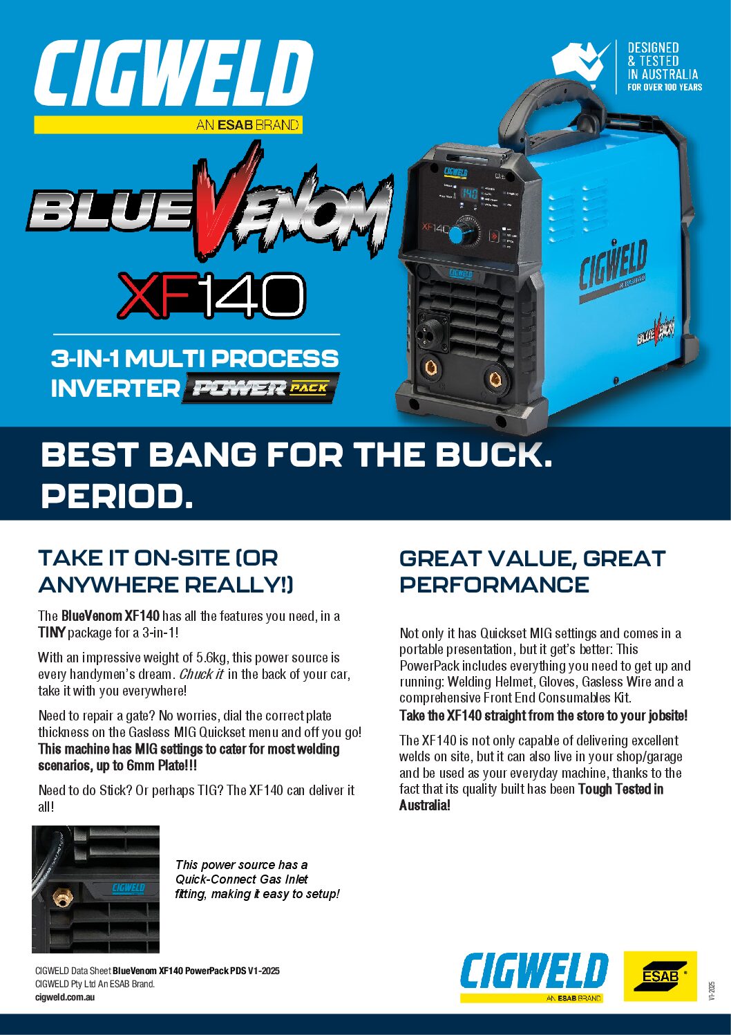The CIGWELD BlueVenom XF140 PowerPack delivers professional multi-process performance in a portable, easy-to-use inverter design. At just 5.6 kg, this 3-in-1 welder lets you tackle MIG, Stick, or TIG jobs anywhere — from the workshop to the farm gate. With QuickSet MIG control, durable construction, and included accessories, it’s the perfect all-rounder for tradespeople, maintenance crews, and DIY welders alike.