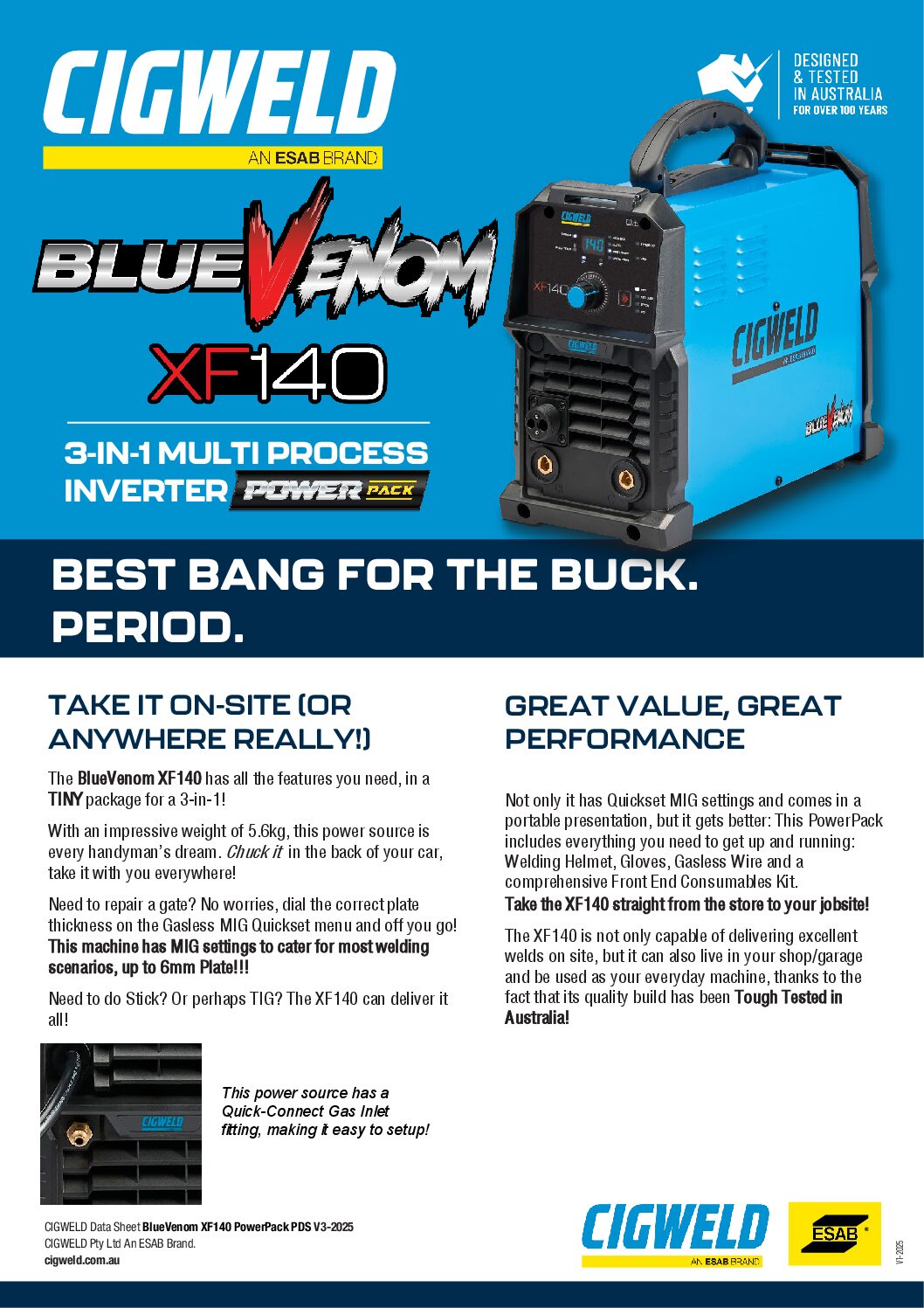 The BlueVenom XF140 PowerPack offers a compact and convenient all-in-one welding package ideal for handyman projects, home workshops and light on-site work.
