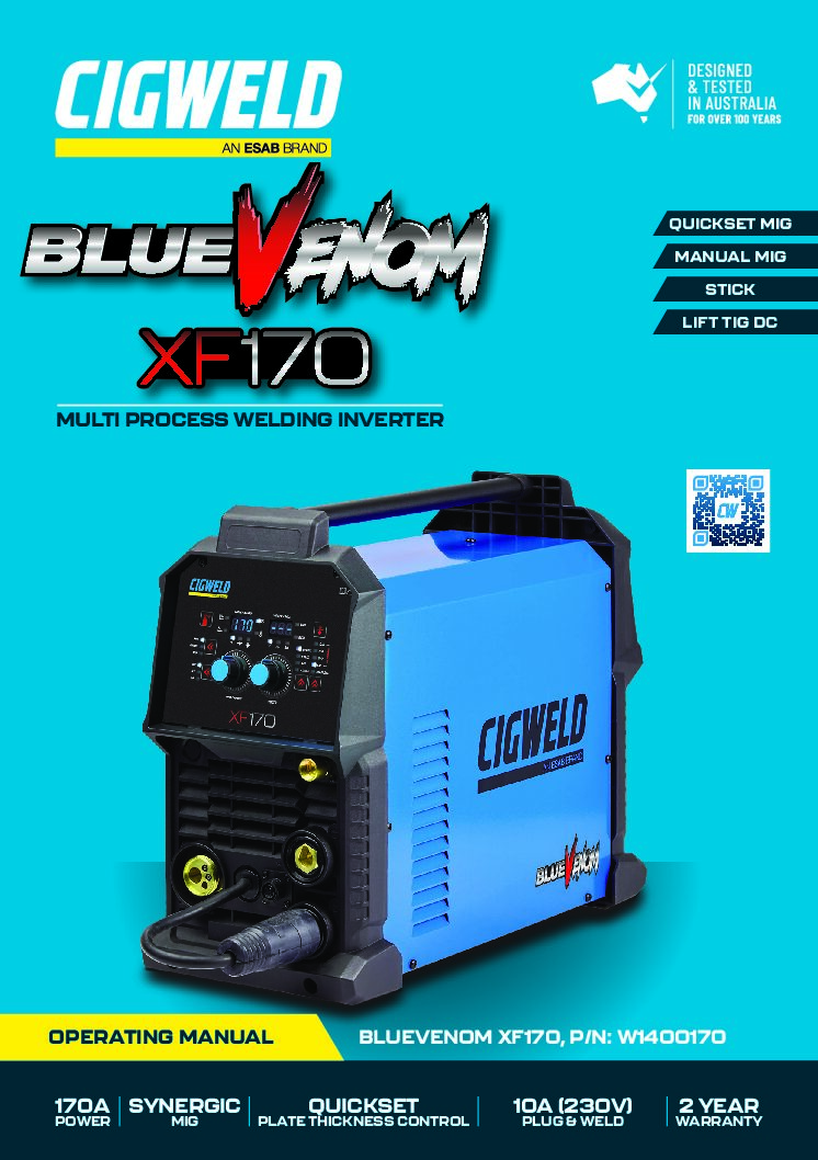 | Duty cycle | MIG: 170A @ 10% (22.5V), Stick: 170A @ 8% (26.8V), TIG: 170A @ 15% (16.8V) |