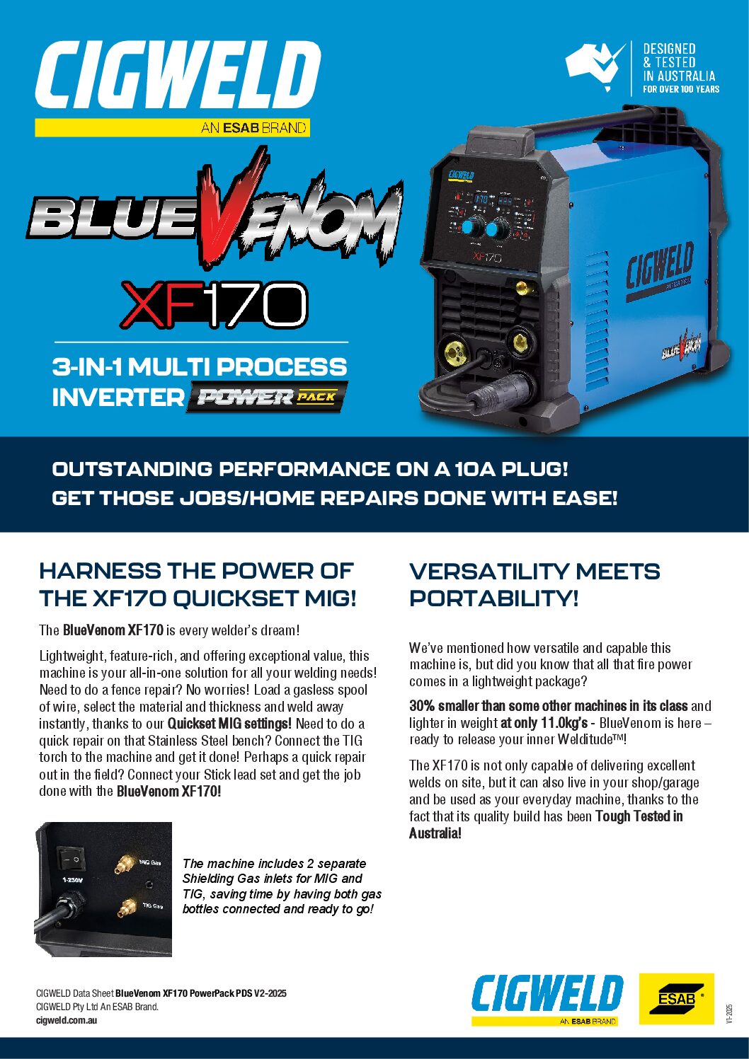 The BlueVenom XF170 PowerPack provides a versatile, fully equipped 3-in-1 welding bundle built for performance across home, workshop and on-site environments.