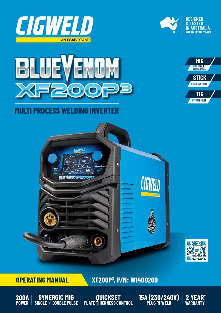 BlueVENOM XF200P3 – Multi Process Welding Inverter The BlueVENOM XF200P3 is the machine for the serious welding enthusiast, tradesperson or professional who needs to fabricate and weld light structures that require TIG-Like welds on Aluminium, Stainless Steel, Bronze or Steel projects, but need the welding speed and ease-of-use of the MIG Process. Suitable for use at maintenance departments, farm/home workshops, job sites and marine repair/service centres without compromising on price for excellent results!