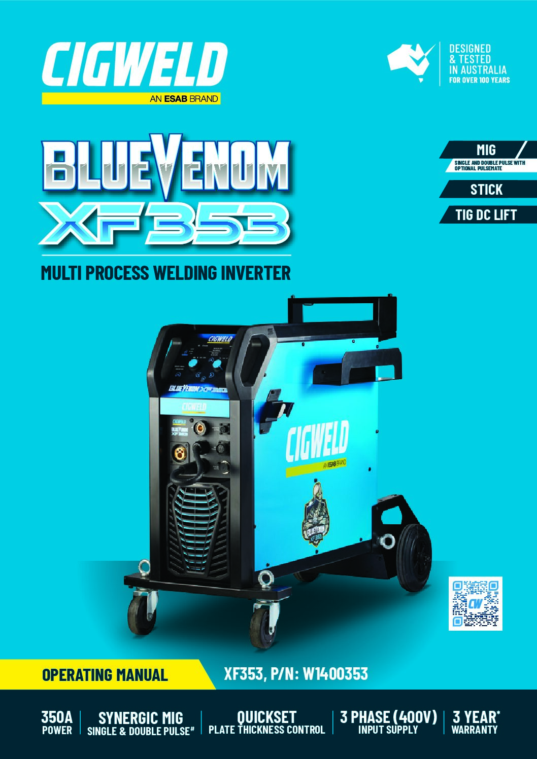 The XF353 can deliver awesome arc characteristics in the most popular processes of, MIG (QuickSet & Manual modes, Gas & Gasless operation, Single & Double Pulse MIG with the optional PulseMate™, STICK (MMA with VRD for extra safety) and TIG DC- Lift welding modes.