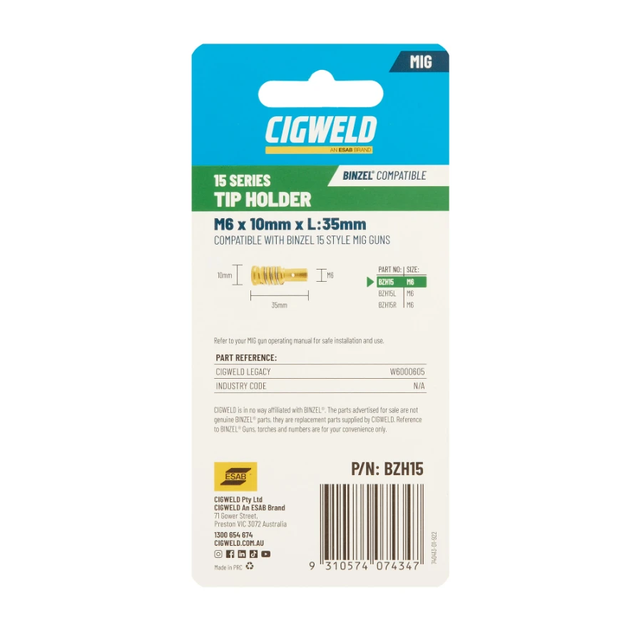 Binzel compatible Contact Tip Holders, designed for the BZL 15 Range of MIG Guns along with the Cigweld E-180 MIG Gun (BZH15R).