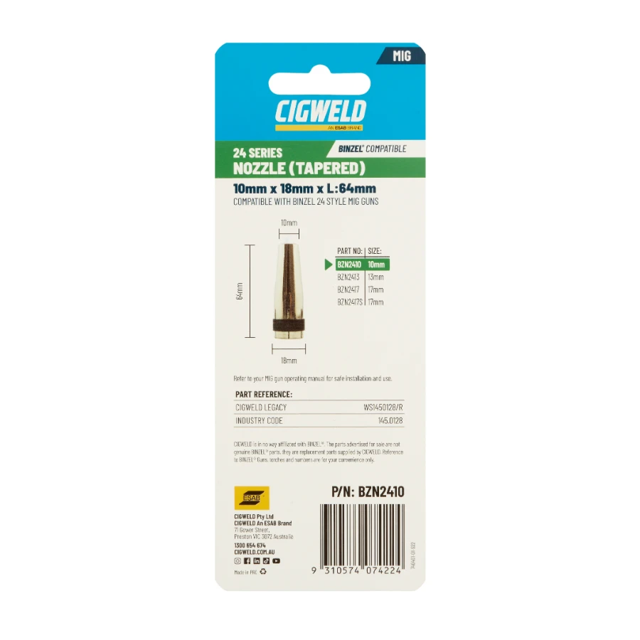 Binzel Compatible MIG Gun Nozzles, made from premium materials to exacting standards for longer lasting consumable life, ensuring optimal shielding gas coverage and engineered for durability and precision, these nozzles promote stable arc performance and reduced spatter.