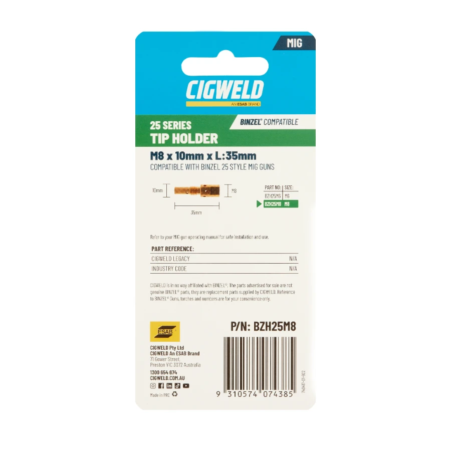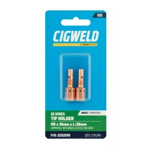 Handy retail packs of 2 pieces which are colour coded for each MIG Gun style for easy identification. The rear of the pack includes product dimensions, available sizes, Cigweld legacy part number, along with the industry recognised part number.