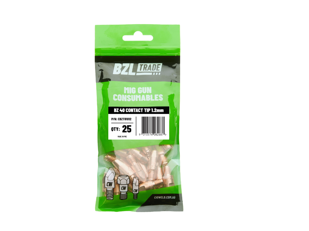Available in M8 x 30mm Long to suit BZ36 and BZ40 MIG Guns and to suit multiple wire diameters from 0.6mm through to 1.6mm wires.