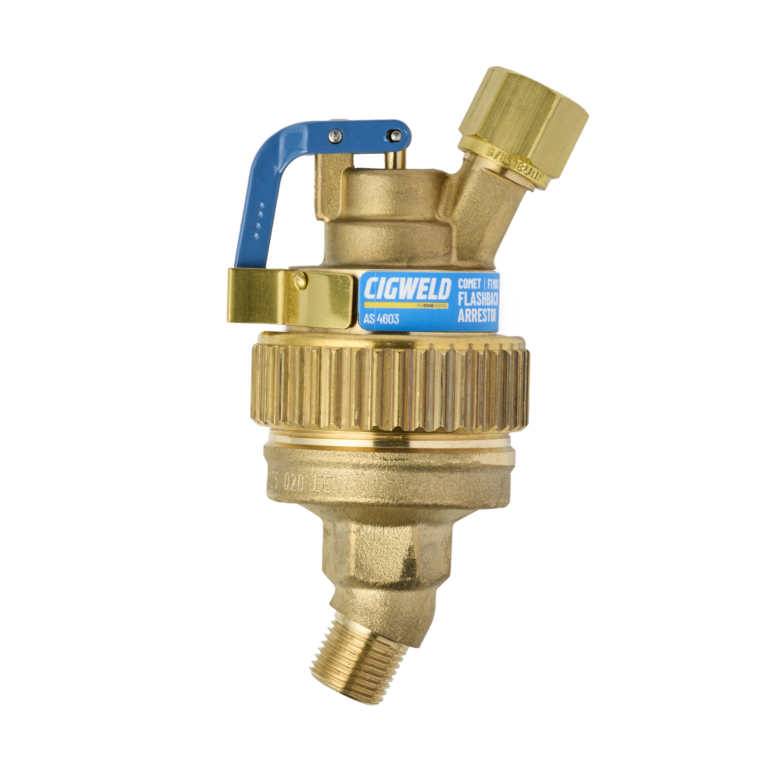 COMET F1 Max FBA are designed for connection to the outlet of regulators incorporating a pressure actuated cut-off valve to prevent further gas flow after a flashback occurs. Pressure actuated cut-off valve to prevent further gas flow after a flashback occurs. The operation is indicated by a signal level. After resetting the lever it is ready for immediate re-use. Non-return valve. Large surface stainless steel conical flame arrestor.