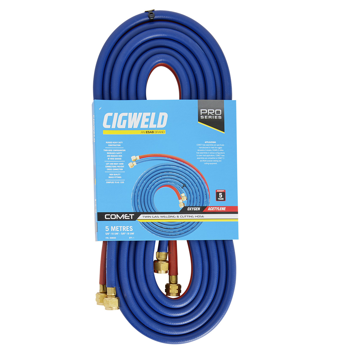 It is important to use the correct type of hose for the required gas(es) to be used. Any non-standard application should always be checked by and approved before being put into operation. Pressure drops will occur through hoses and hose fittings, therefore allowances must be made to compensate for this when setting up equipment and adjusting regulators. 10mm bore hose should be used for large flow applications and where long lengths of hose are to be used. Colour coding of hoses and different threads for fuel and Oxygen prevents incorrect connections of hoses to the wrong gas type. CIGWELD twin hoses help to keep the work area tidy, which reduces the risk of hose damage.