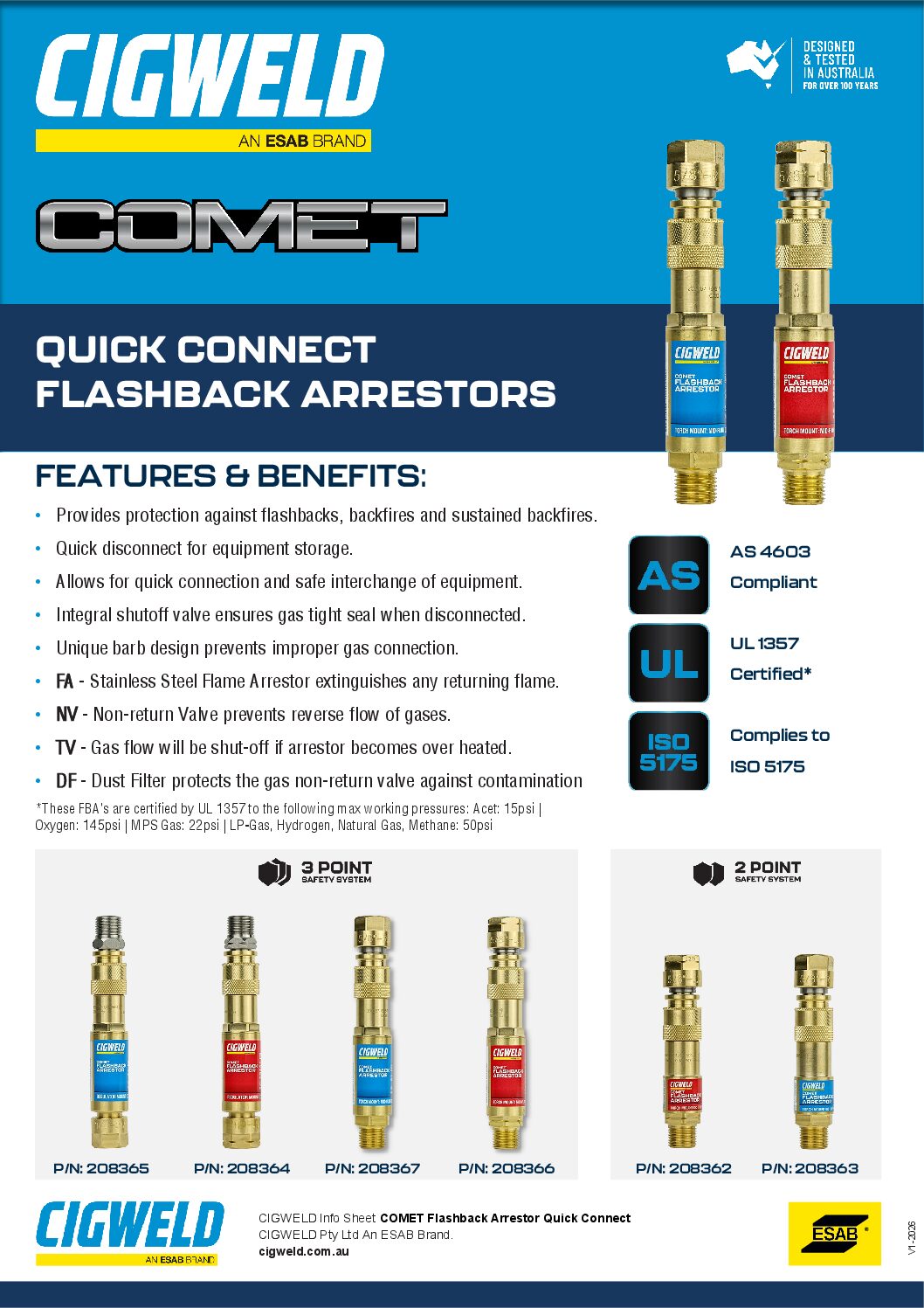 These COMET™ Quick Connect FBA’s are designed to prevent flashback flame and reverse flowing gases inside the regulator or blowpipe from burning or mixing in the hose and gas supply system.