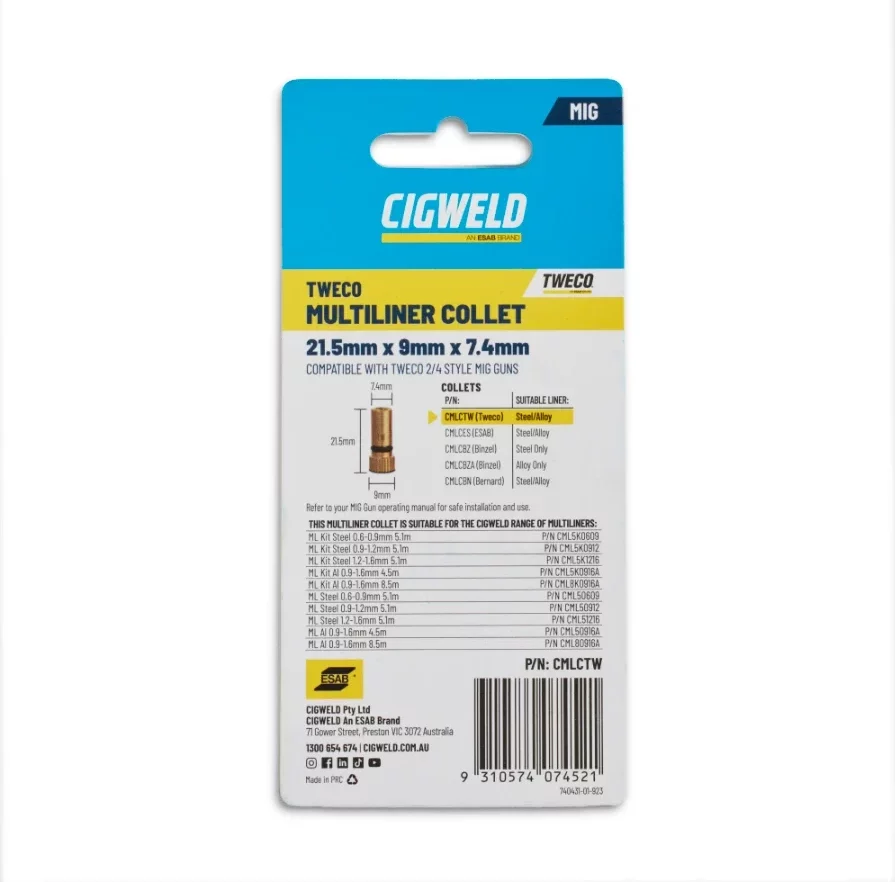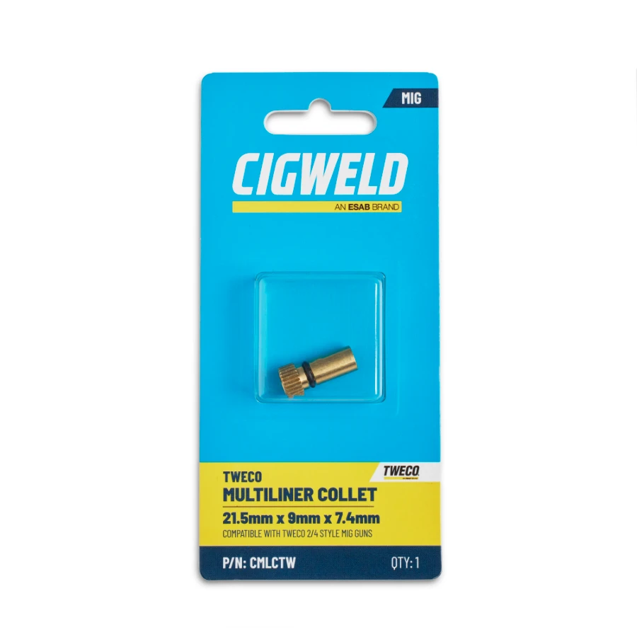 The CIGWELD MULTILINERS have been designed for the ultimate ease of use and to eliminate the need to have every brand of liner in stock. Available in Kit form that includes a liner to suit a variety of wire diameters, along with 3 collets to suit the main MIG guns on the market (Tweco, Binzel® Alloy and Bernard®), or with the liner by itself and you simply select the appropriate collet and you’re ready to go.