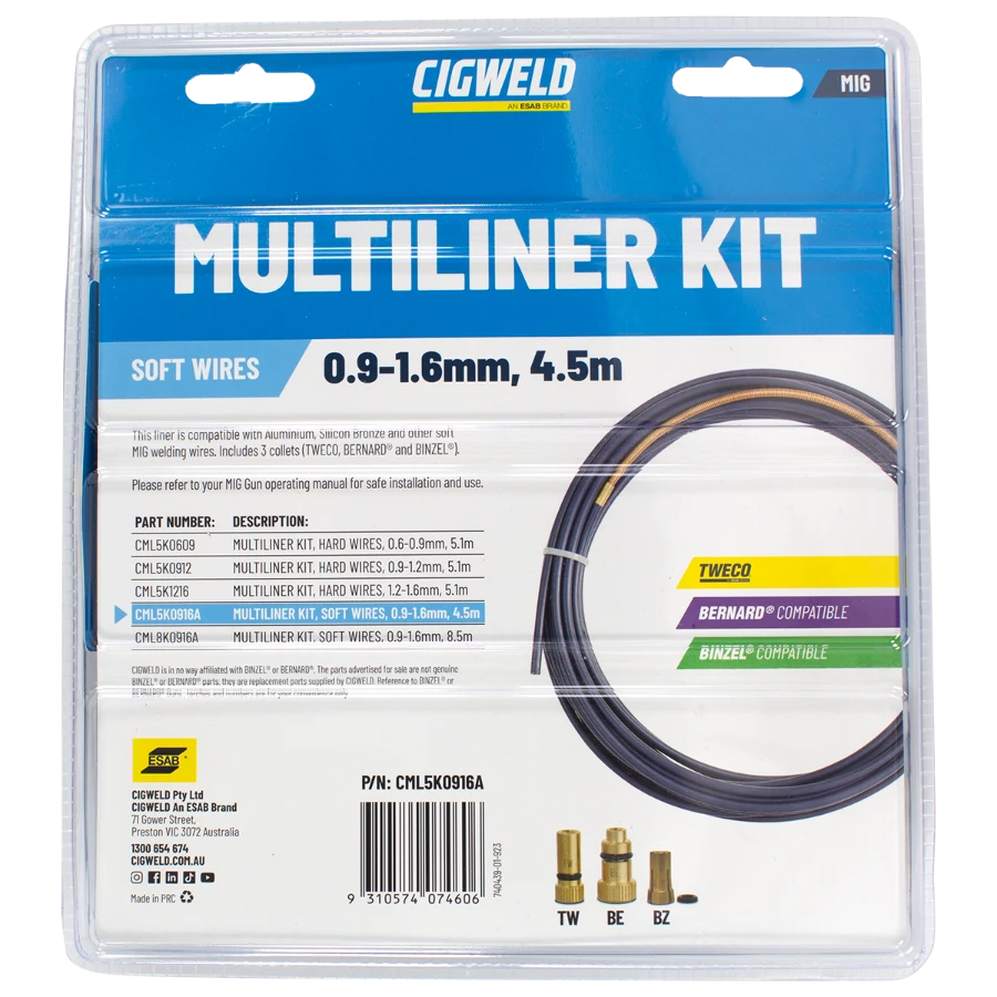 The CIGWELD MULTILINERS have been designed for the ultimate ease of use and to eliminate the need to have every brand of liner in stock. Available in Kit form that includes a liner to suit a variety of wire diameters, along with 3 collets to suit the main MIG guns on the market (Tweco, Binzel® and Bernard®), or with the liner by itself and you simply select the appropriate collet and you're ready to go.