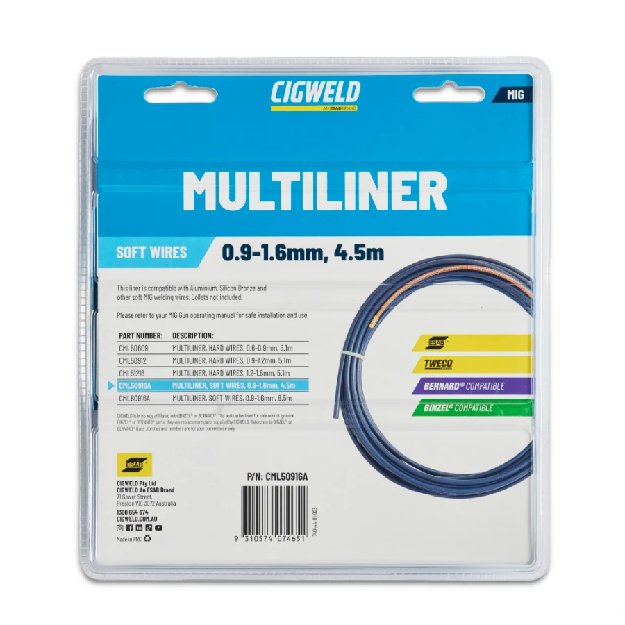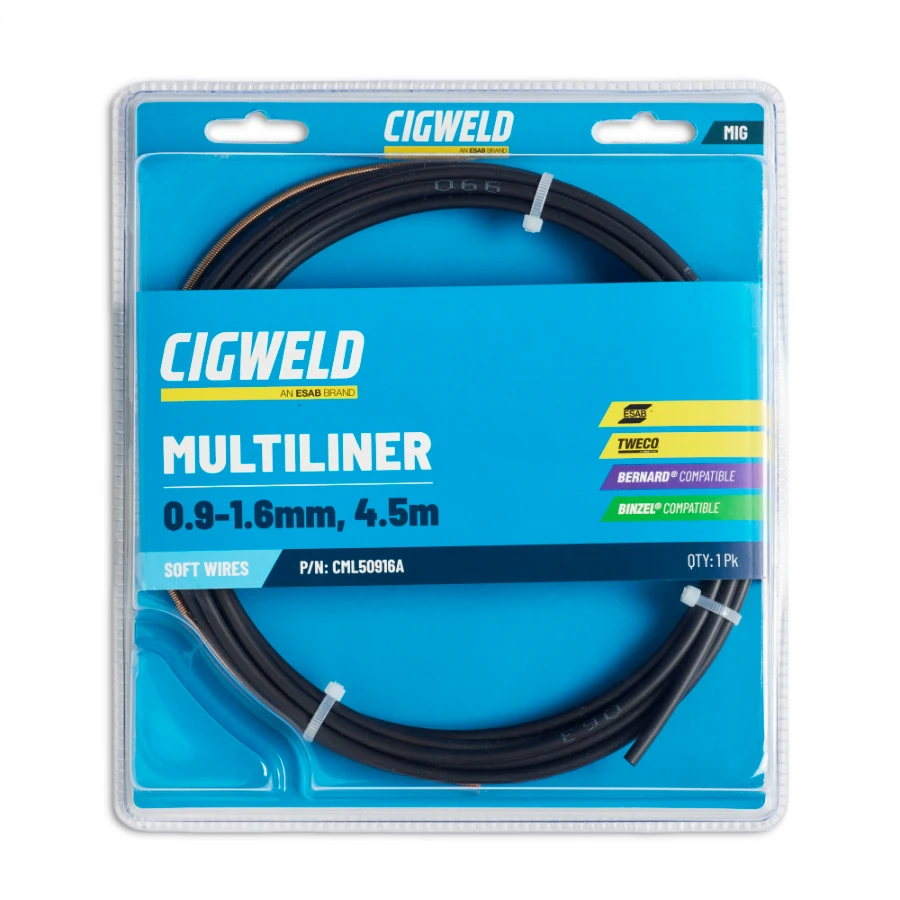 Ensure smooth wire feeding with the Cigweld MultiLiners. Suitable for different wire sizes, both hard wires and soft wires. Engineered for durability and precision, this liner facilitates consistent and reliable wire delivery, minimizing downtime and improving weld quality. Upgrade your welding equipment with this essential component for efficient MIG welding operations.