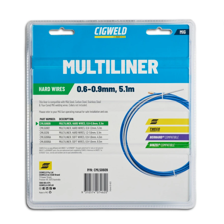 Ensure smooth wire feeding with the Cigweld MultiLiners. Suitable for different wire sizes, both hard wires and soft wires. Engineered for durability and precision, this liner facilitates consistent and reliable wire delivery, minimizing downtime and improving weld quality. Upgrade your welding equipment with this essential component for efficient MIG welding operations.