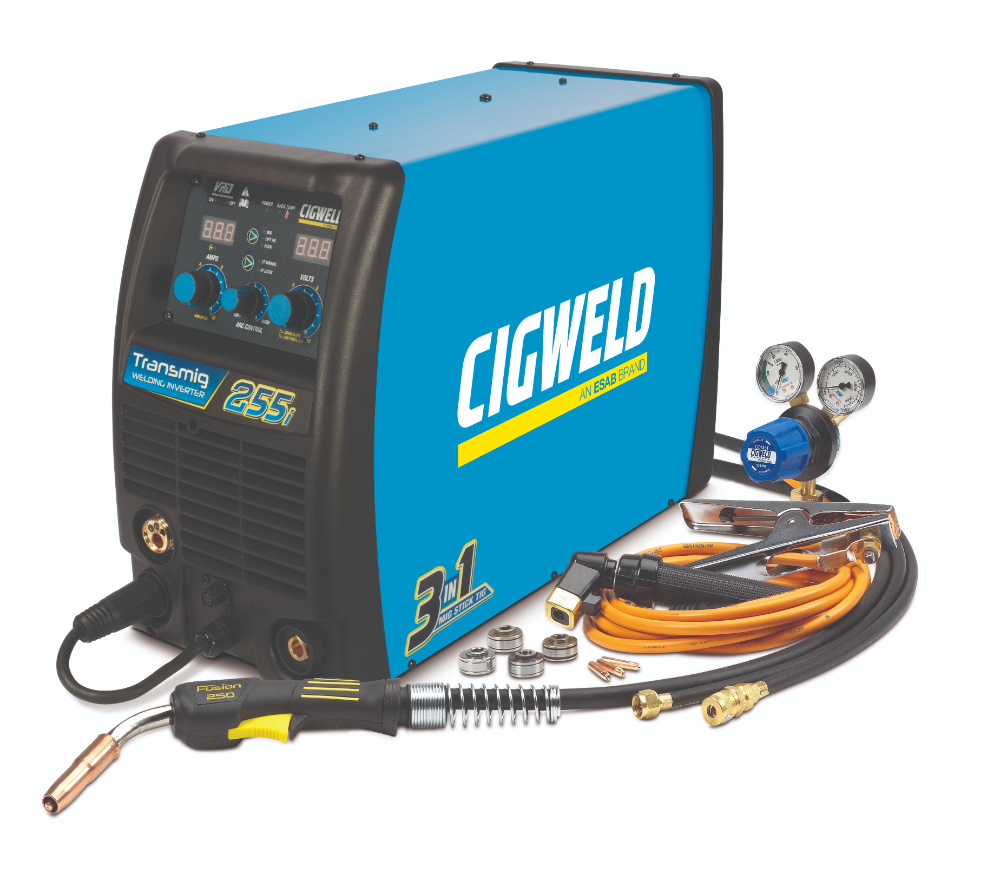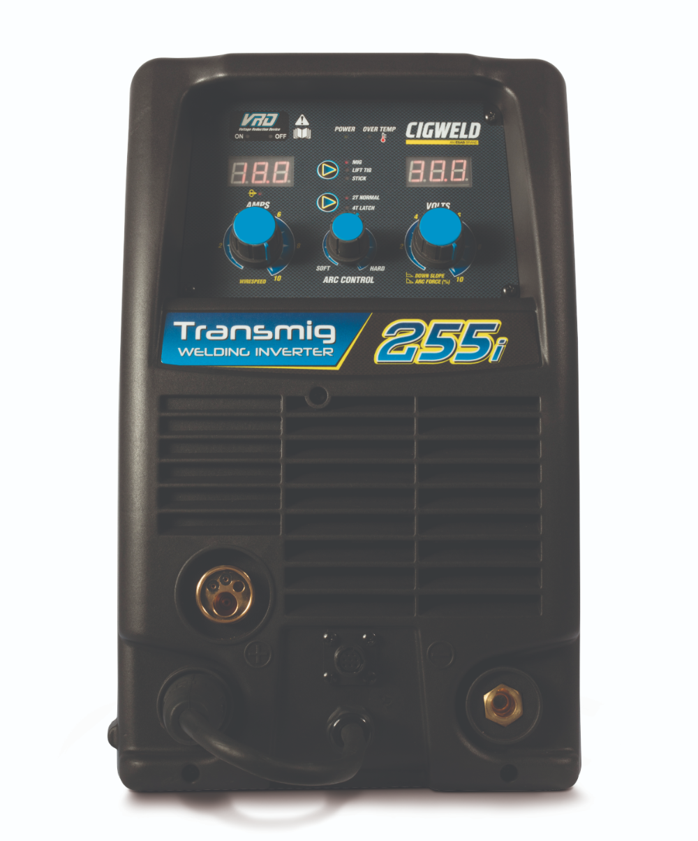 The CIGWELD Transmig 255i is a self contained single phase multiprocess welding inverter with digital voltage and amperage meters, that is capable of performing MIG (GMAW/FCAW), Stick (MMAW) and Lift TIG (GTAW) welding processes. It is ideal for welding plate thicknesses between 0.8mm and 12mm with a range of wires from 0.6mm-1.2mm (solid), and has the added benefit of running the Tweco SGT250 Spool Gun for the convenience of your precision aluminium work.