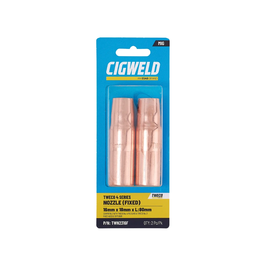 Tweco MIG Gun Fixed Nozzles, made from premium materials to exacting standards for longer lasting consumable life, ensuring optimal shielding gas coverage and engineered for durability and precision, these nozzles promote stable arc performance and reduced spatter.
