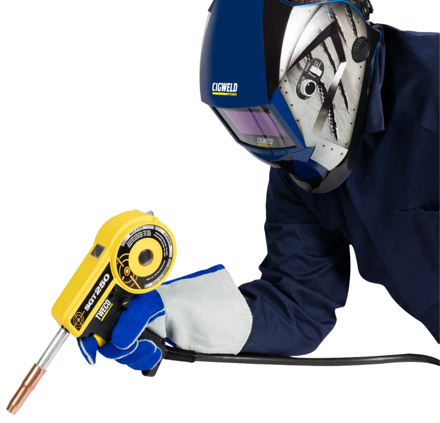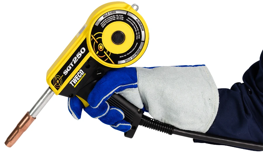 The Tweco SGT250 is a comfortable pistol grip spool gun that has the cable connected from the handle for a well-balanced, light weight feel in the hand and easy manoeuvrability for precision welding.