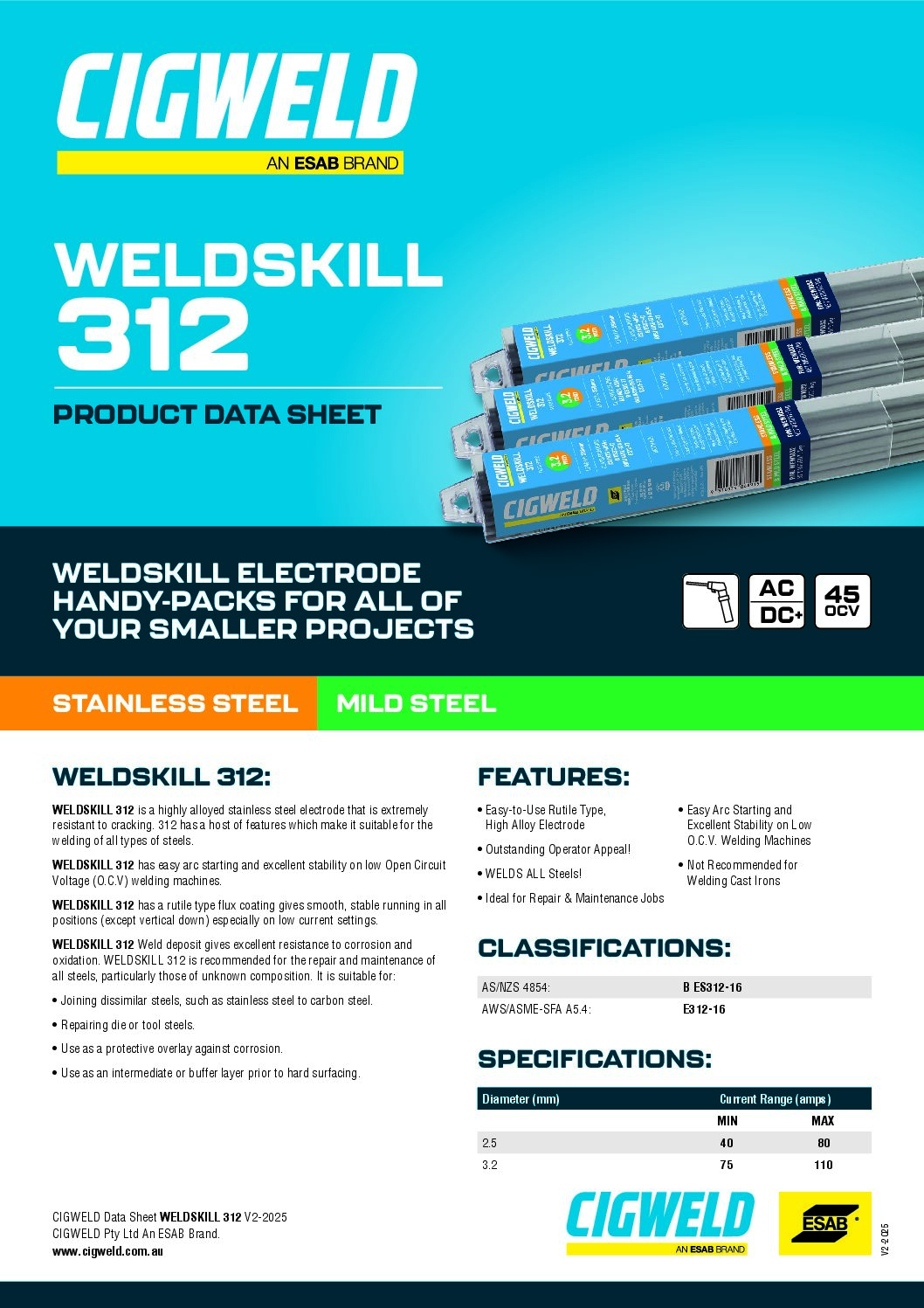 WELDSKILL 312 weld deposit gives excellent resistance to corrosion and oxidation. It is recommended for the repair and maintenance of all steels, particularly those of unknown composition. It is suitable for;