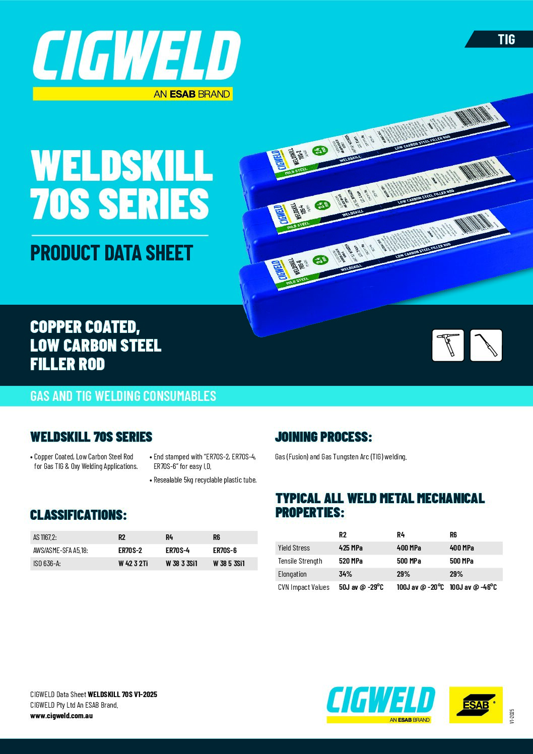 Weldskill 70S-4 is a copper coated, low carbon steel filler rod suitable for the Gas and Gas Tungsten Arc (TIG) welding of a wide range of mild and medium strength steels.