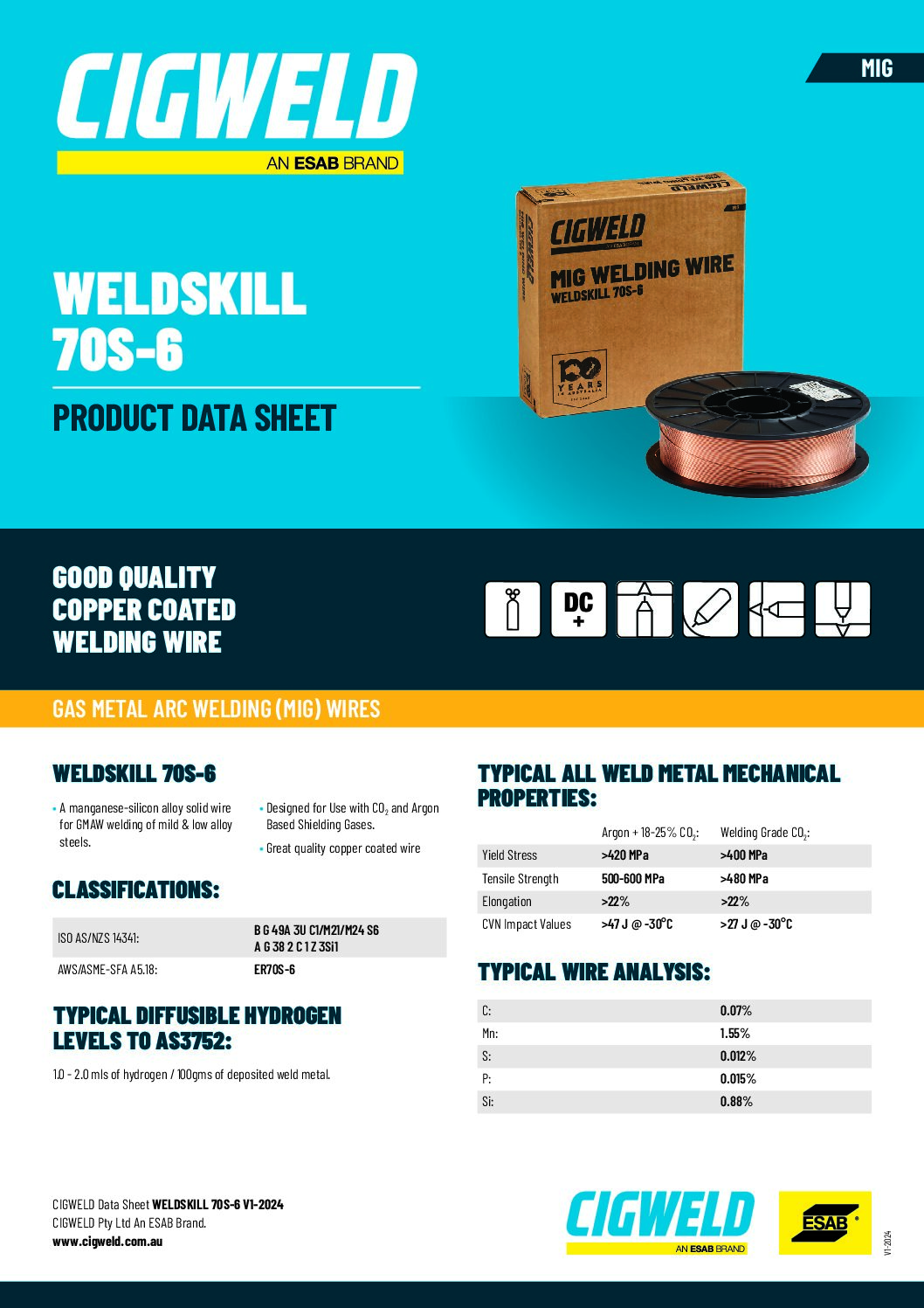 Weldskill 70S-6 is a Gas Metal Arc Welding (GMAW) copper coated wire suitable for all positional fillet and butt welding of mild and medium strength steels. The higher silicon content of Weldskill 70S-6 ensures great operator appeal, fillet shape / side wall wash at weld toes and low spatter levels.