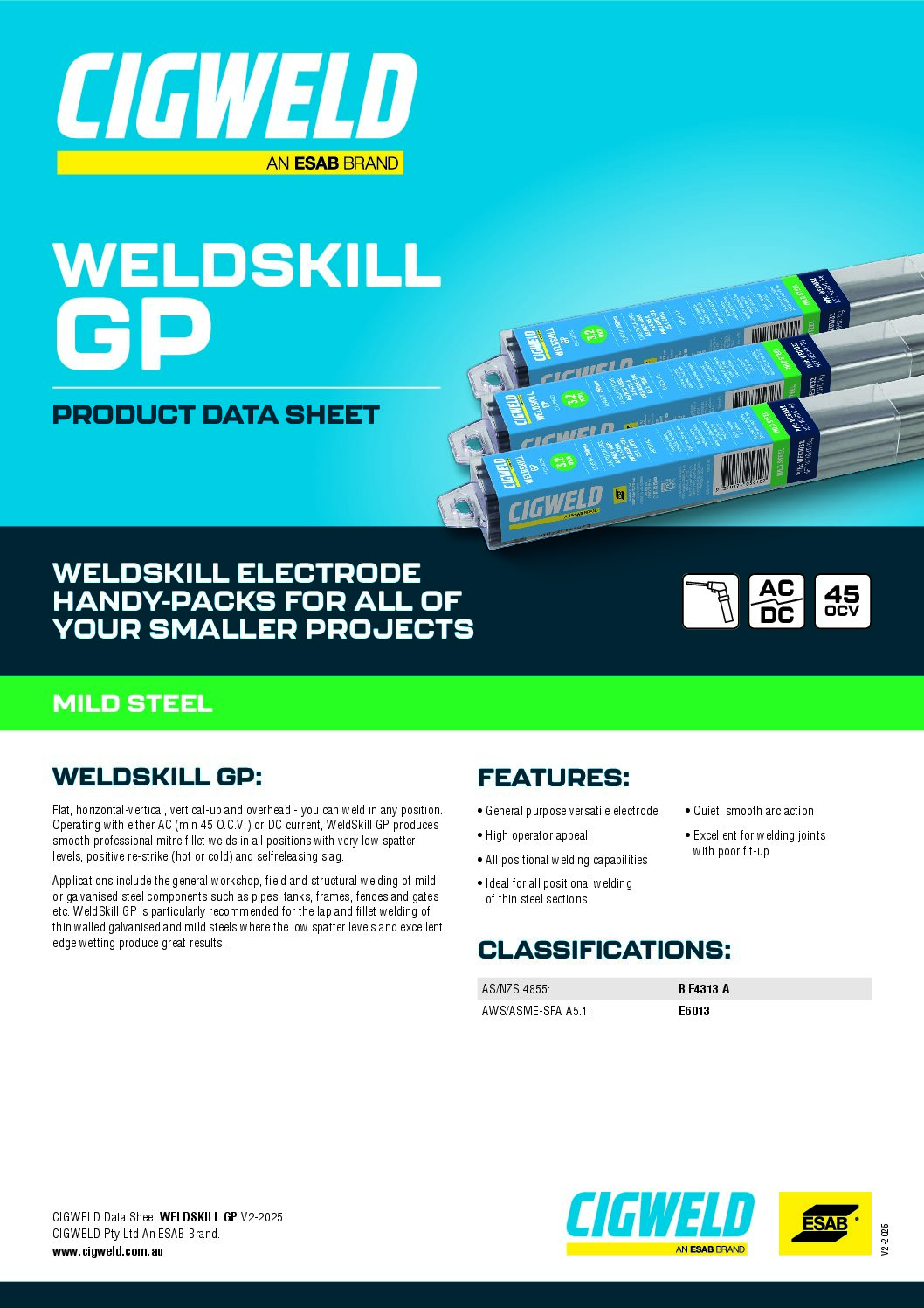 Weldskill GP is a general purpose versatile E6013 electrode with high operator appeal. Ideal for the vertical-down welding of thin steel sections.
